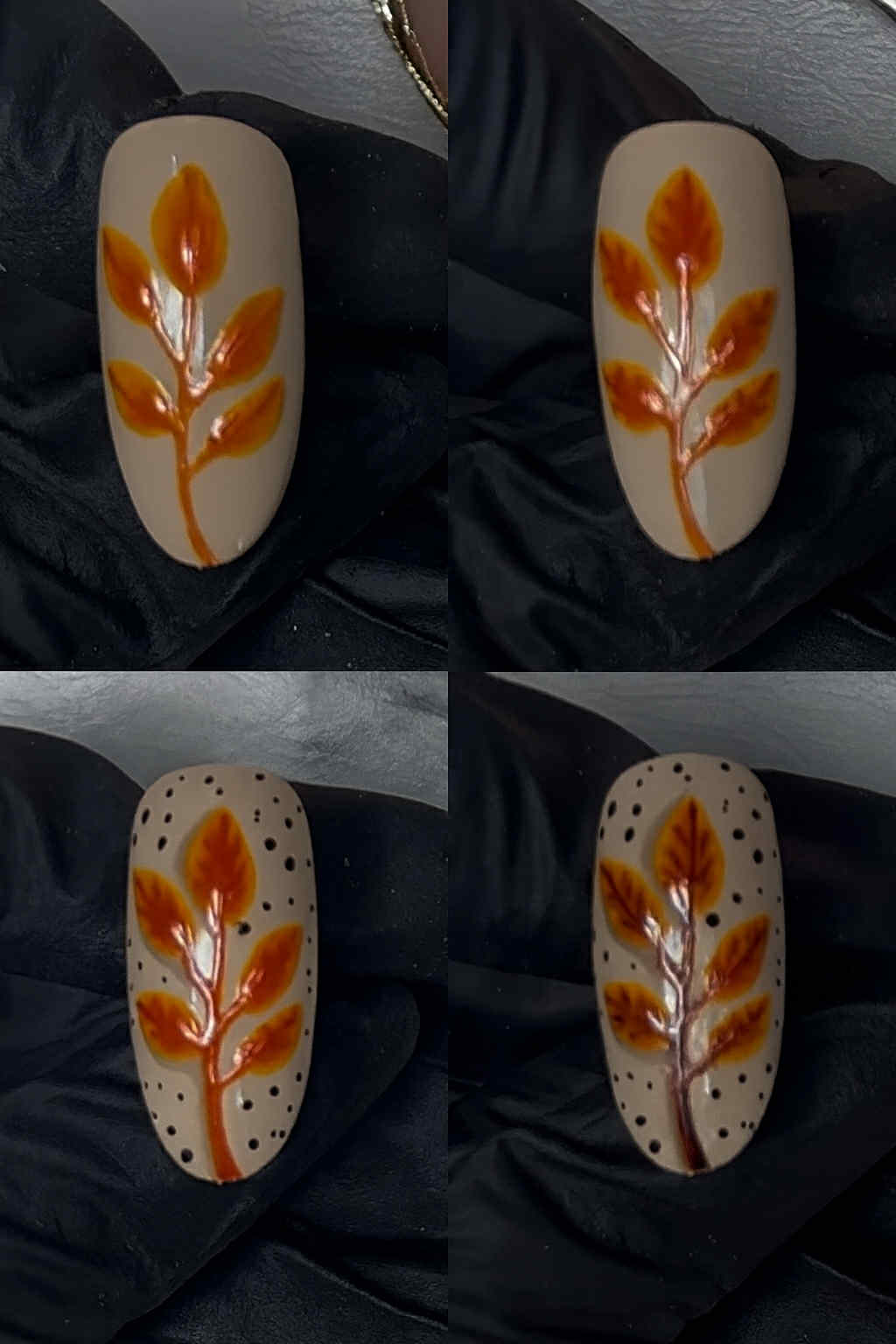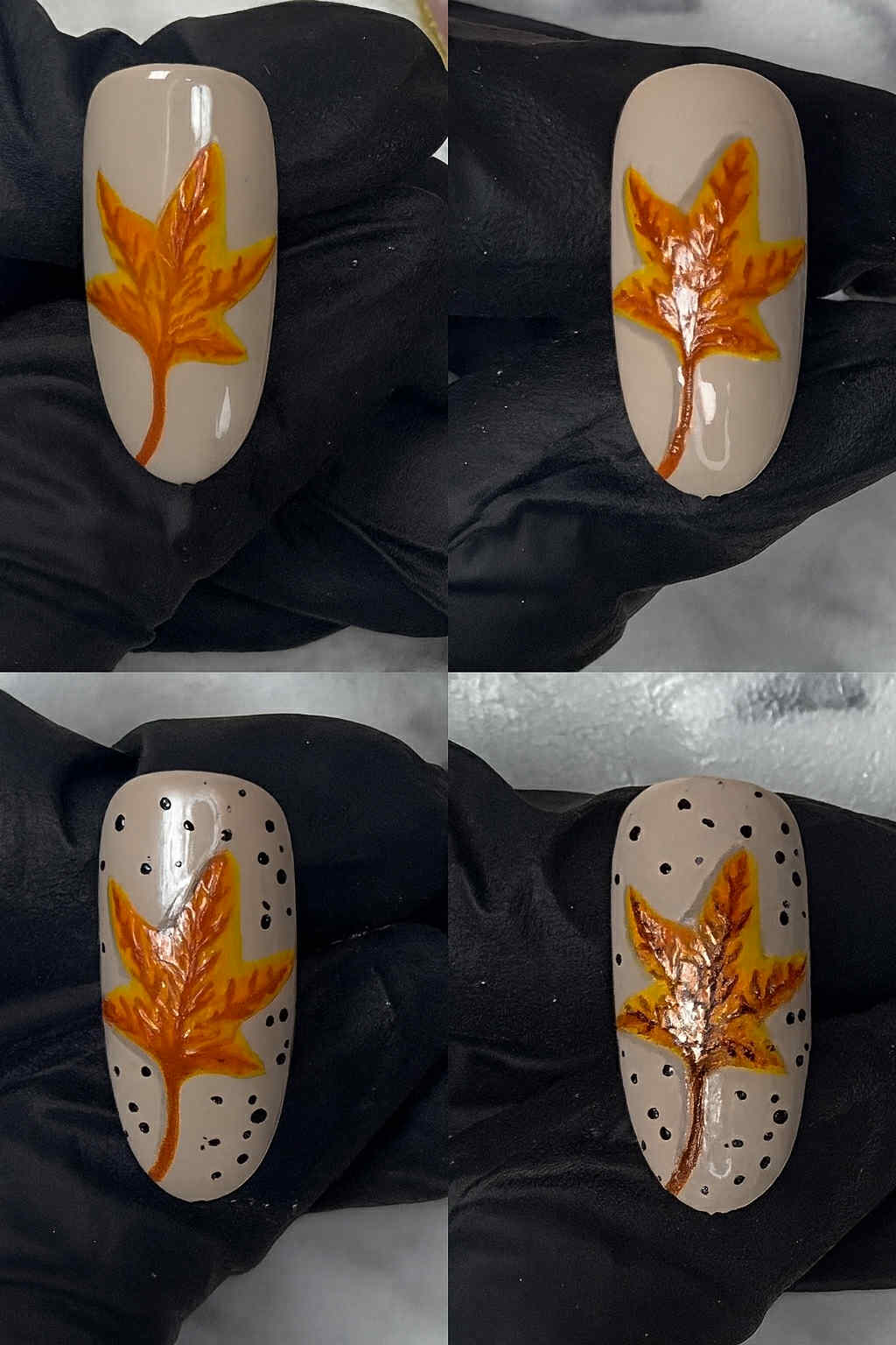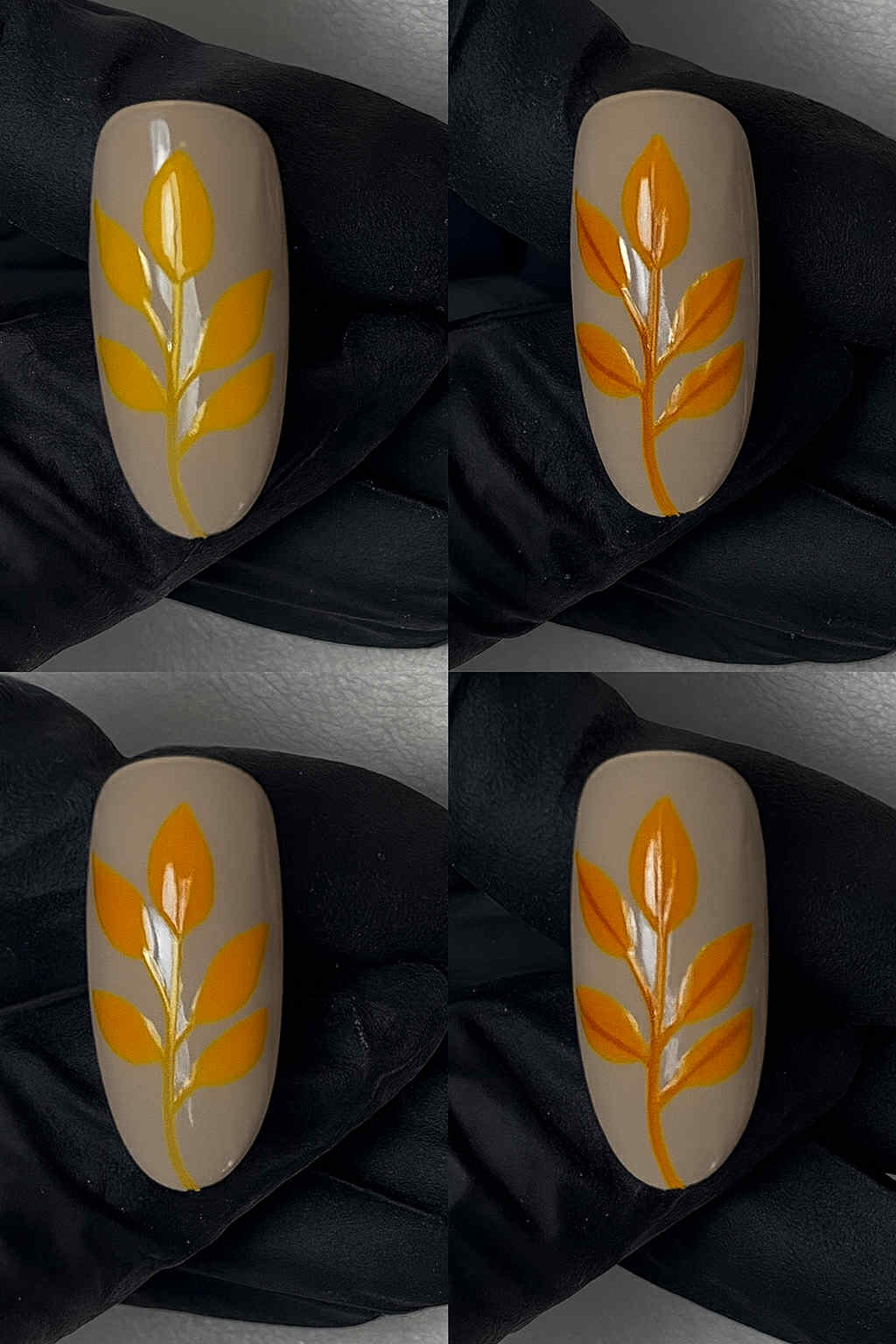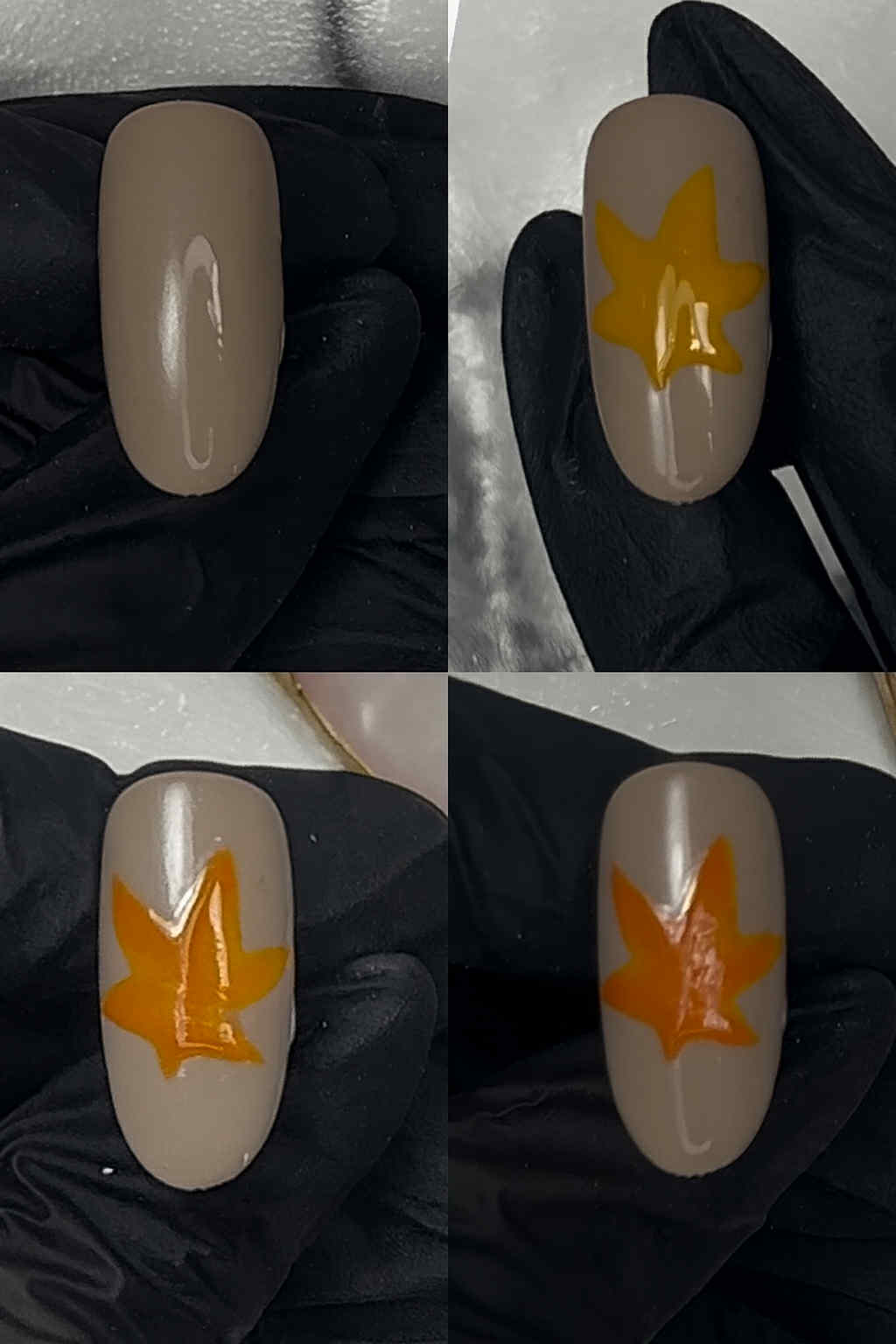 3. Bland oransje farge med litt blank base lakk så fargen blir svakere. Legg i kantene av bladet og herd i lampe. Repeter med samme farge uten at den er blandet ut. Herd i lampe.