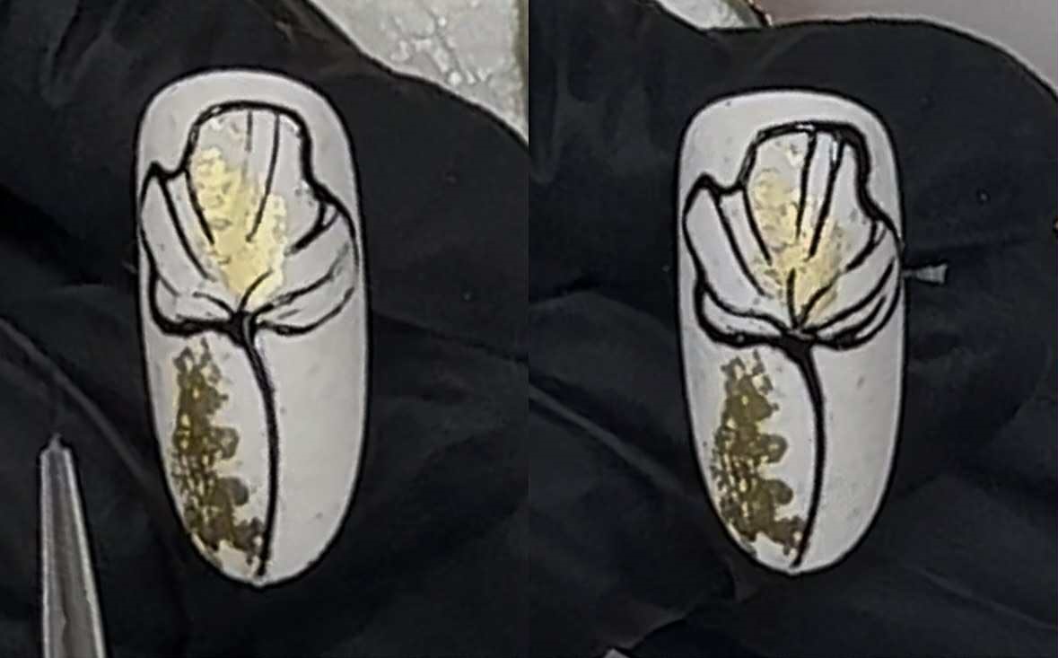 2. Legg folie over det klissete laget etter fargen og dra av så folien fester seg. Legg matt topplakk over og herd i lampe.